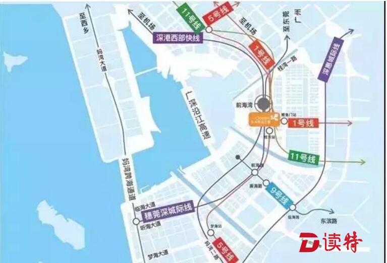 樞紐部分由地下5條軌道線路及口岸和公交、出租、旅游大巴等交通接駁場站構成??傆玫孛娣e約20公頃。前海綜合交通樞紐由政府投資,深圳地鐵集團建設。項目分為近期和遠期兩部分實施。預計2020年完成這項交通巨制的地下土建。目前地鐵1、5、11號線前海灣站已經(jīng)開通,穗莞深城際線預計年內(nèi)將開工,港深西部快線正在規(guī)劃中。
