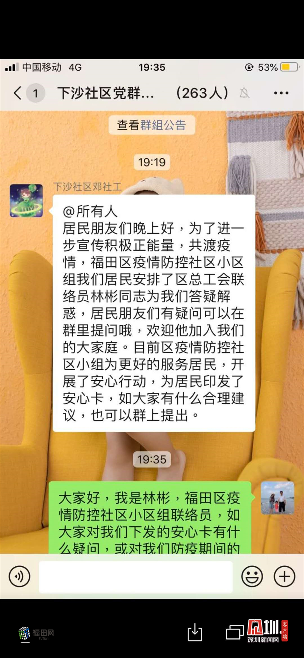 針對居民最關(guān)心自己居住的小區(qū)是否有確診病例、有無疑似病例、有無居家隔離人員的困惑,特別是出現(xiàn)了確診病例小區(qū)的居民更迫切想了解本小區(qū)采取了哪些防疫措施保證居民安全。福田區(qū)安心行動第一條就是實施小區(qū)(村)疫情防控每日一播報機制,每個重點小區(qū),工作組安排一名處級干部和一名科級干部化身安心聯(lián)絡(luò)員,進到小區(qū)業(yè)主群,督促配合小區(qū)物業(yè)管理處按指定模板公告今日疫情防控播報,保障居民知情權(quán),同時聽取收集居民對防疫的意見建議,協(xié)調(diào)聯(lián)系解決,并反饋落實結(jié)果,對不能馬上解決的做好解釋說明。