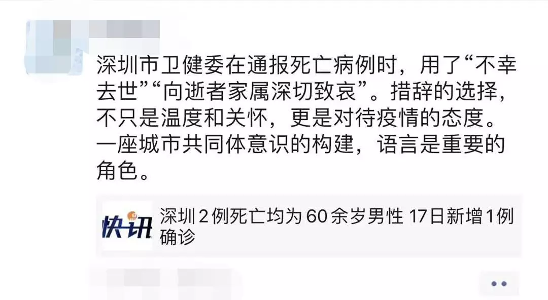 深圳市衛(wèi)健委在通報死亡病例時,用了“不幸去世”“向逝者家屬深切致哀”。措辭的選擇,不只是溫度和關懷,更是對待疫情的態(tài)度。