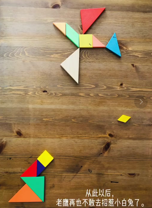 劉鼒彧在完成課后作業(yè)時,和媽媽一起通過“七巧板”拼成了很多圖形,有大炮、小白兔、老鷹、花叢……鼒彧突發(fā)奇想,“我可以用七巧板來講一個故事呀!”,不一會兒,她一邊用七巧板擺著各種形狀,一邊開始講述自己的原創(chuàng)故事——《勇敢的小兔》。