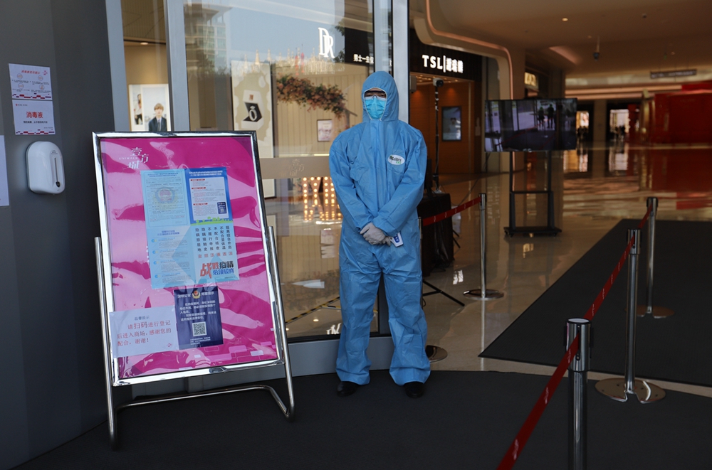 當(dāng)天上午11時(shí),記者來到壹方城,過去熱鬧的正門廣場上如今僅有寥寥幾個(gè)行人。往大門走去,記者看到兩側(cè)的門已經(jīng)關(guān)閉,只留下中間的通道給市民進(jìn)出,進(jìn)口和出口分開,市民進(jìn)入商場時(shí)必須掃碼實(shí)名登記,身著防護(hù)服的工作人員在入口處引導(dǎo)市民登記和測溫。