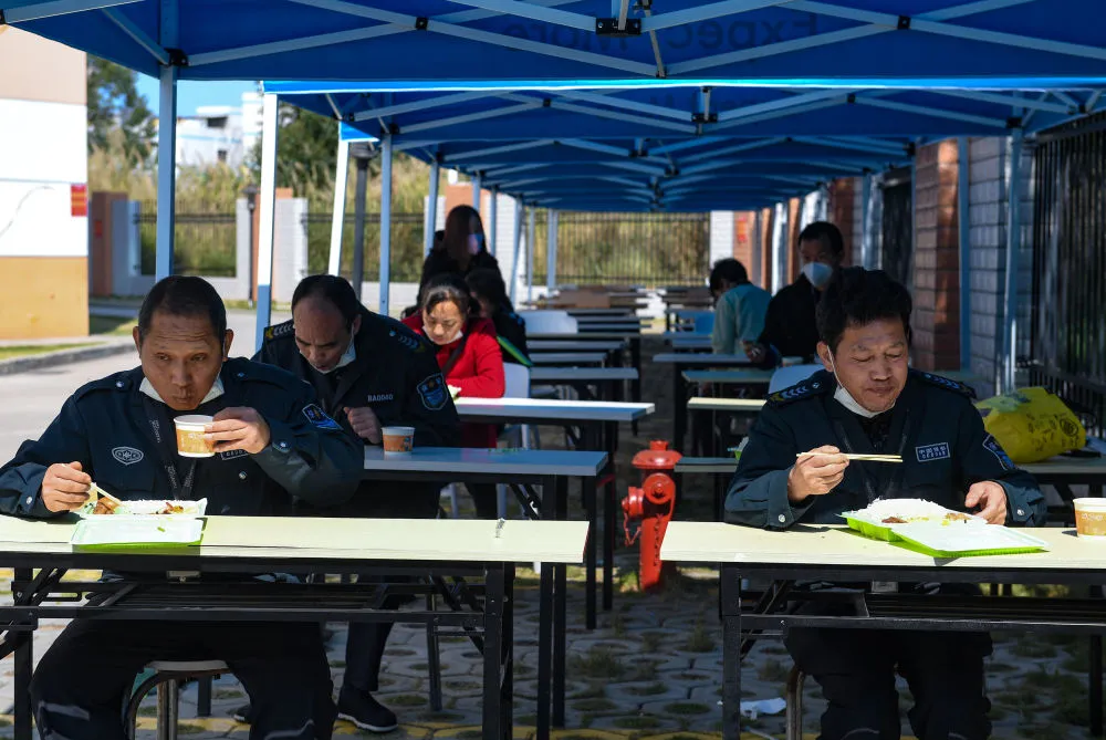 位于福城街道的泰衡諾科技有限公司園區(qū),員工在臨時“食堂”分桌就餐。
