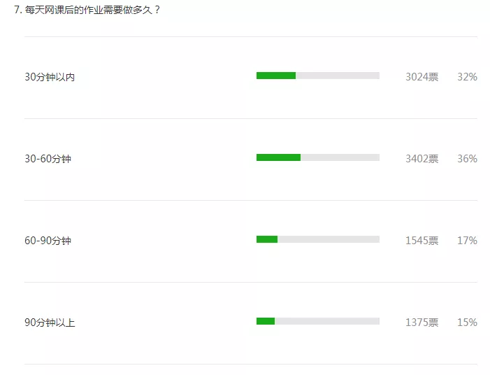 根據(jù)投票結果,68%的人認為網(wǎng)課后的作業(yè)在60分鐘內可以完成。不過,許多參與者認為網(wǎng)課后的作業(yè)對于家長來說負擔較重。