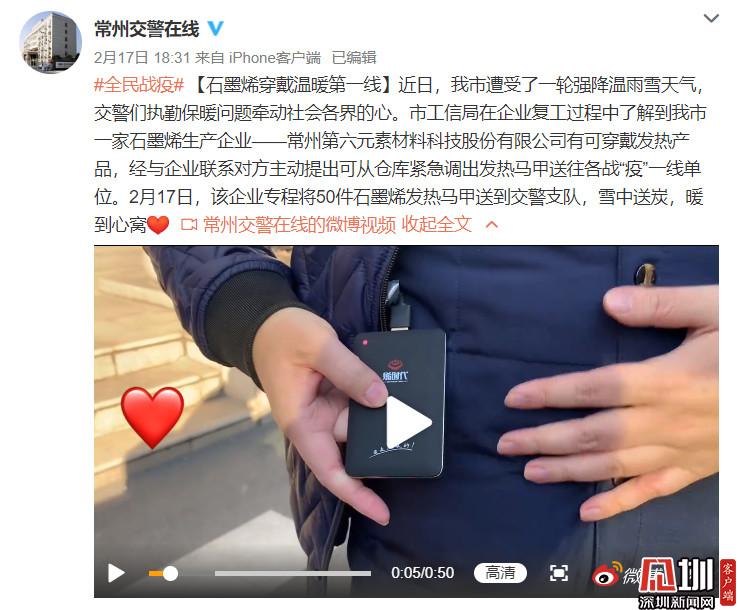 2月18日,一場大雪降臨常州,風大雪大溫度低,常州各單位一線工作者堅守崗位,一如既往地扎實做好疫情防控工作。烯旺科技聯合兄弟企業(yè)常州第六元素向奮斗中在抗疫中執(zhí)勤一線的常州交警支隊,惠山區(qū)公安局、惠山經濟開發(fā)區(qū)執(zhí)勤人員捐贈共計160件純石墨烯發(fā)熱馬甲,價值23.7萬元,以此向一線工作者送去溫暖,并致以崇高的敬意。