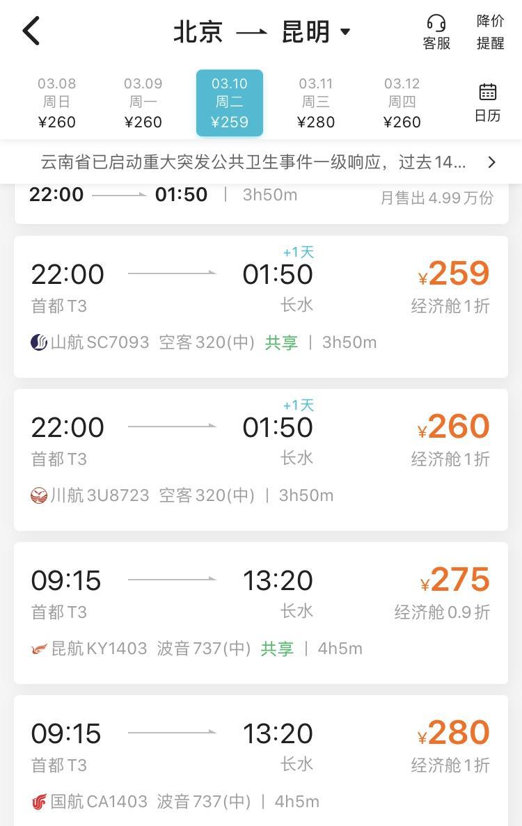 此外,3月份,由北京、上海等城市出發(fā)的航班也出現(xiàn)了1折左右的"白菜價(jià)"。比如去哪兒旅行 APP上顯示,3月10日,北京飛昆明的山航 SC7093航班,機(jī)票價(jià)格最低為259元,折扣為經(jīng)濟(jì)艙全票的1折。當(dāng)天,川航3U8723、昆航 KY1403、國航 CA1403等航班的最低票價(jià),也僅為經(jīng)濟(jì)艙全票的1折左右,價(jià)格分別為260元、275元、280元。