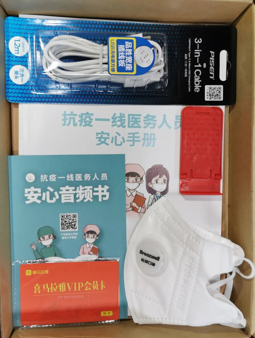 這是一個(gè)20x28cm2的普通牛皮紙紙盒,里面最顯眼的,是一本《安心手冊(cè)》,一張“抗疫一線醫(yī)務(wù)人員安心音頻書”卡,一張音頻APP的有聲書卡,和兩個(gè)N95口罩。此外,筆記本、筆、手機(jī)充電線、手機(jī)支架,也都細(xì)心地配全了。紙盒旁還放著一個(gè)小巧玲瓏的智能聲控音箱,使用者“不沾手”就能使用,防止病毒傳播。小東西里,也藏著大關(guān)愛。