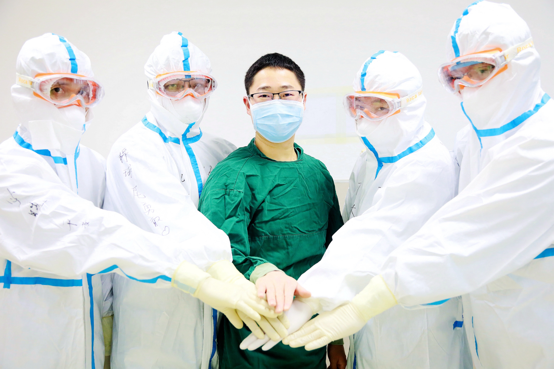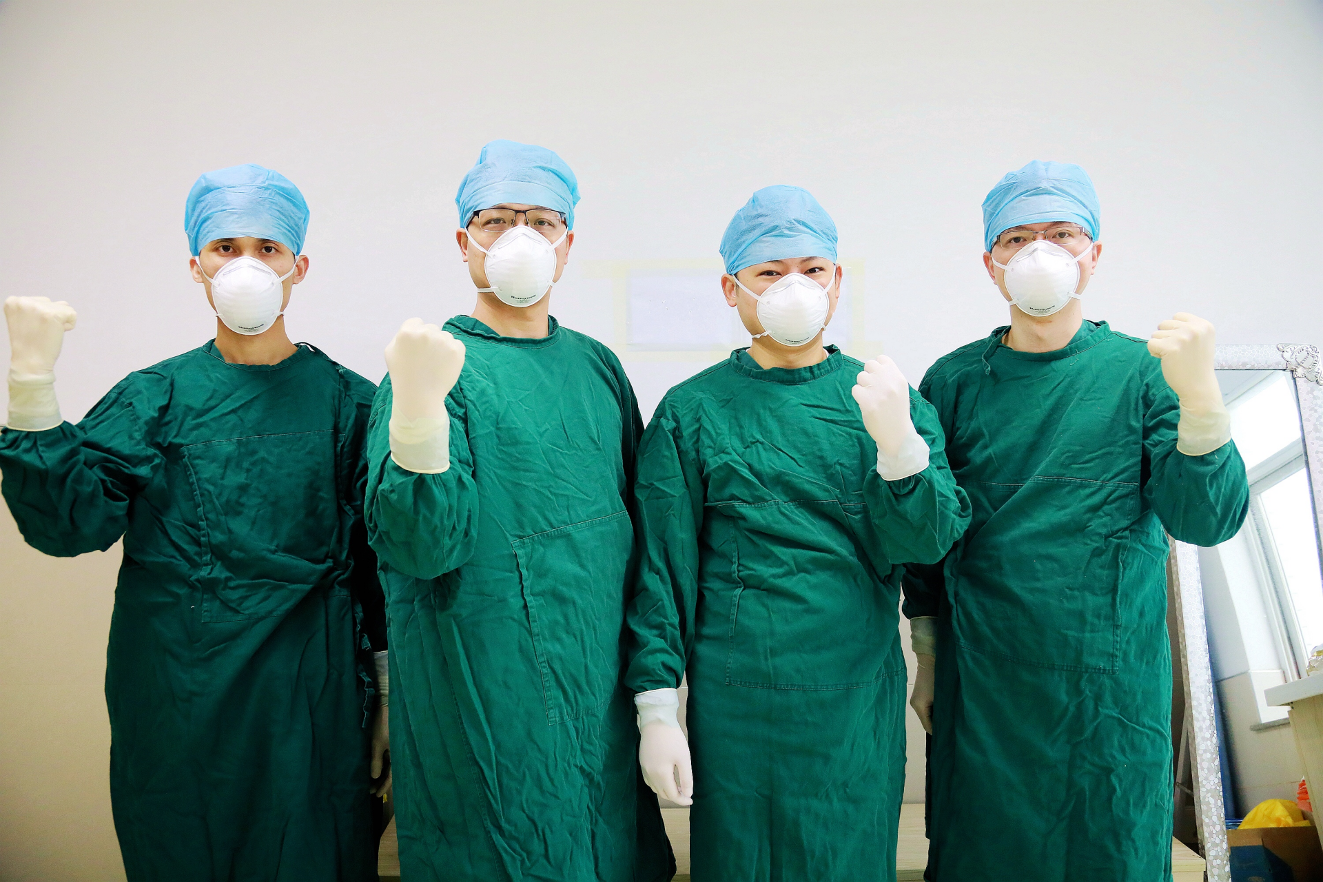 “四小金剛”與珠海中醫(yī)院重癥監(jiān)護科的戰(zhàn)友蘇文平(中)在進入戰(zhàn)位前合影。
