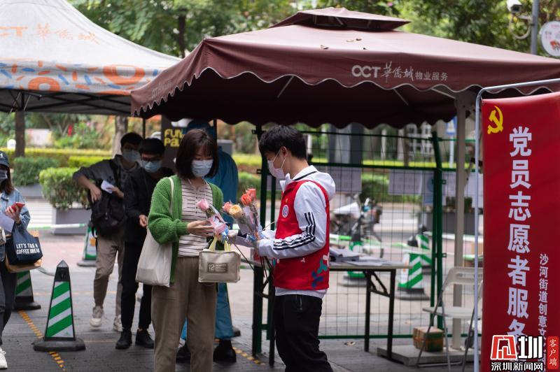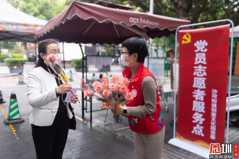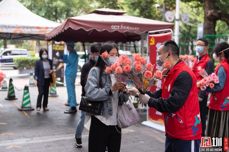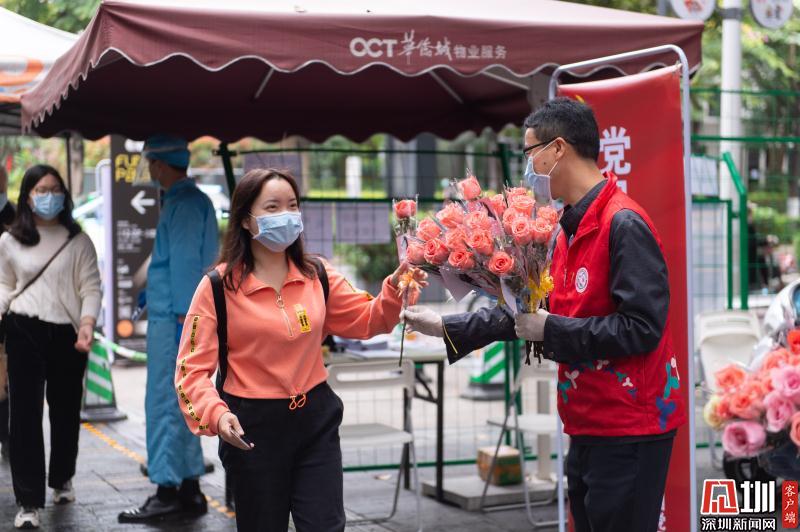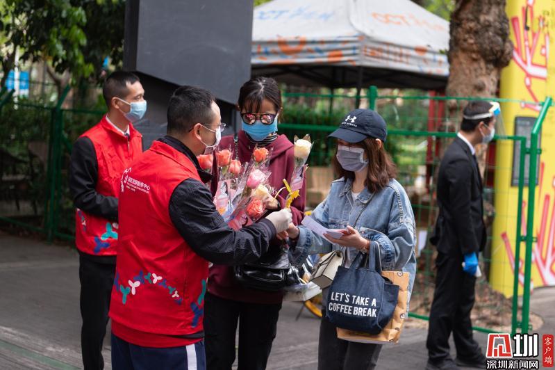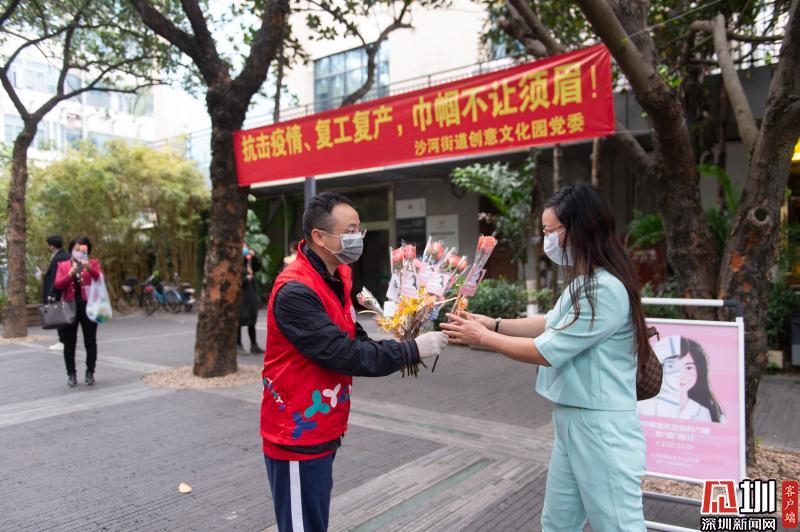 見圳客戶端·深圳新聞網(wǎng)2020年3月6日訊 3月6日上午,春暖花開,萬物更新。華僑城創(chuàng)意文化T街入口,進入園區(qū)上班的員工除了接受體溫檢測、出示入園卡等常規(guī)動作外,女員工意外收到了一束鮮花和一張“三八”節(jié)賀卡,賀卡上寫著:帶著溫柔堅定的力量抗“疫”前行!這是園區(qū)黨員志愿者對“抗擊疫情、復(fù)工復(fù)產(chǎn)”中廣大女職工的禮贊。