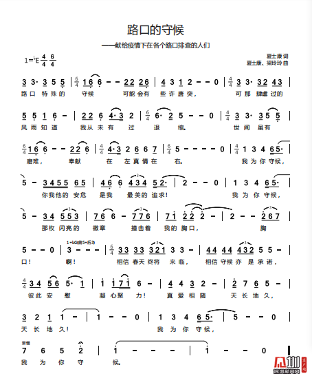 近日,龍崗區(qū)文化廣電旅游體育局職工夏士康、梁玲玲聯(lián)合北京自由音樂人劉珂銘創(chuàng)作的歌曲《路口的守候》正式推出?!奥房冢厥獾氖睾?,可能會有些唐突,可那肆虐過的風(fēng)雨知道,我從未有過退縮……”該歌曲以抗疫一線實(shí)錄為背景,深情表達(dá)了對以“路口戰(zhàn)士”為代表的抗疫戰(zhàn)士們的敬愛之情,及眾志成城、抗疫必勝的堅定信念。