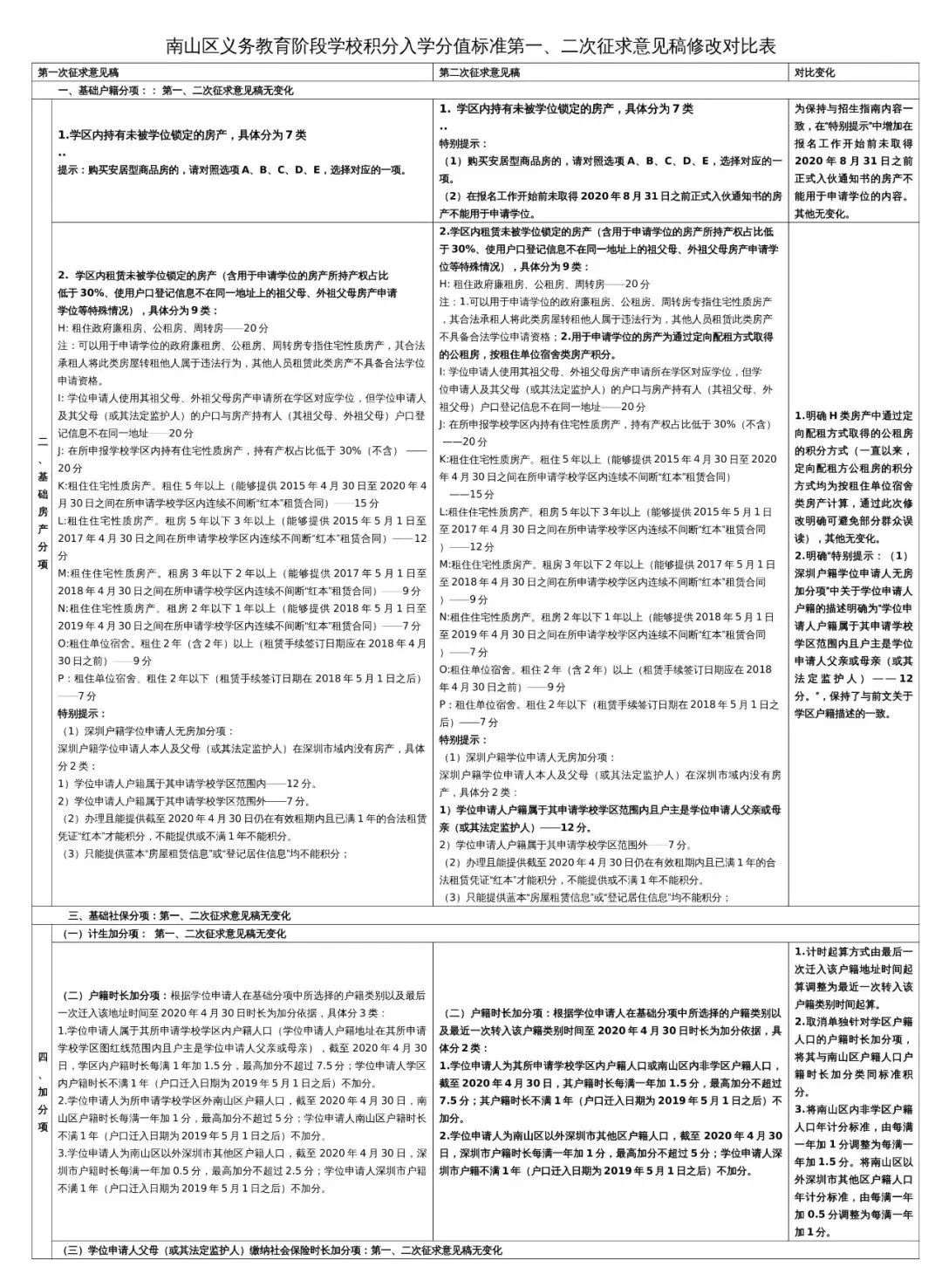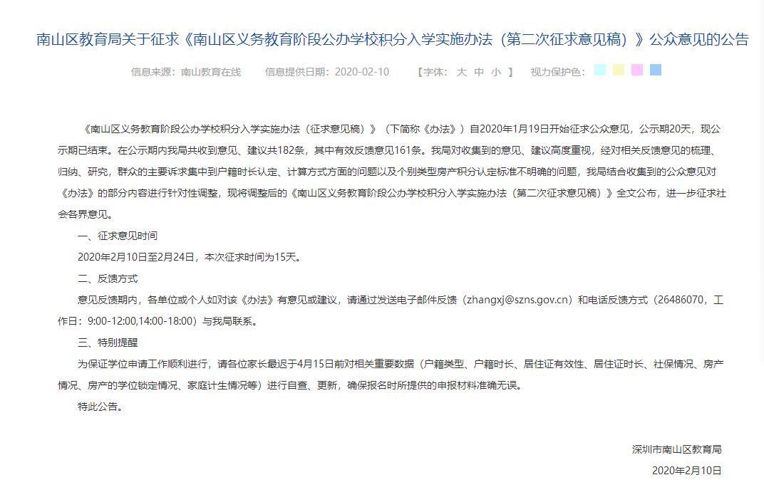 1月19日,南山區(qū)教育局第一次征求意見發(fā)出后,共收集到關(guān)于積分算法調(diào)整的反饋意見182條,并于2月10日第二次發(fā)布《南山區(qū)義務(wù)教育階段公布學校積分入學實施辦法》征求意見稿(以下簡稱《意見》),根據(jù)《意見》內(nèi)容,擬調(diào)整2020年積分入學辦法。