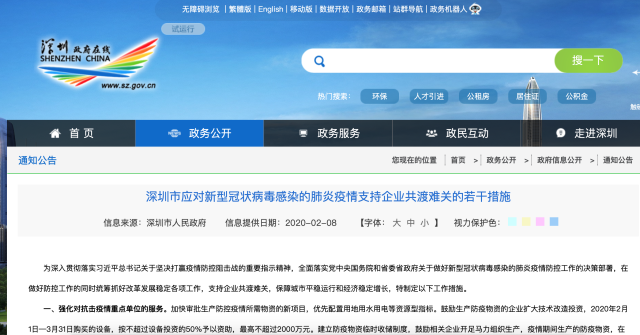 深圳發(fā)布《深圳市應(yīng)對(duì)新型冠狀病毒感染的肺炎疫情支持企業(yè)共渡難關(guān)的若干措施》