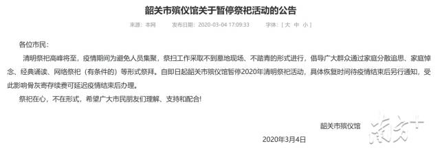 據(jù)統(tǒng)計(jì),截至3月15日17時(shí),深圳、汕頭、中山等地發(fā)文明確,全市暫停祭掃服務(wù),倡導(dǎo)通過家庭追思、網(wǎng)絡(luò)祭掃、書寫寄語等方式遙祭先人、慎終追遠(yuǎn)。此外,韶關(guān)市殯儀館暫停2020年清明祭祀活動(dòng)。