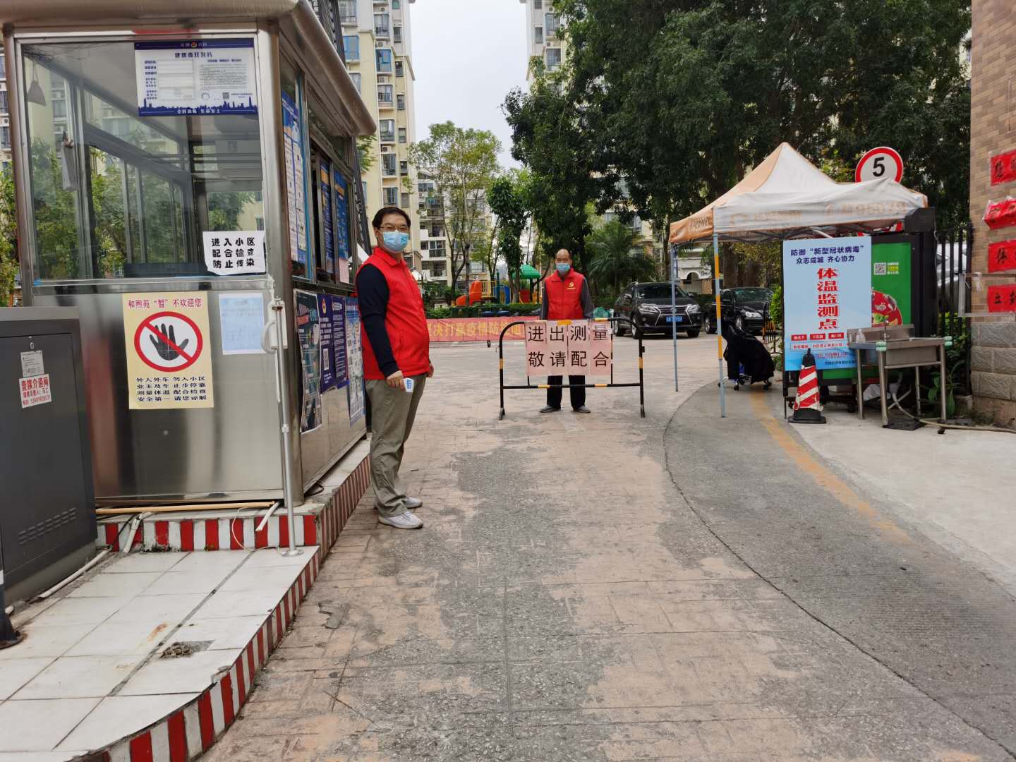 “梁經(jīng)理,我也是一名黨員,我申請(qǐng)加入咱們小區(qū)的疫情防控隊(duì)伍?!痹诓趟龠_(dá)的帶動(dòng)下,兒子蔡榮釗也積極投身防控“疫”線中。每日下班后,他都從寶安的工作單位趕回小區(qū),來到門崗卡點(diǎn),為進(jìn)出小區(qū)人員進(jìn)行登記、測(cè)量體溫,攔截外來人員和車輛。蔡榮釗這一堅(jiān)持,就是一個(gè)多月,得到了物業(yè)管理處和業(yè)主(住戶)們的高度好評(píng)。