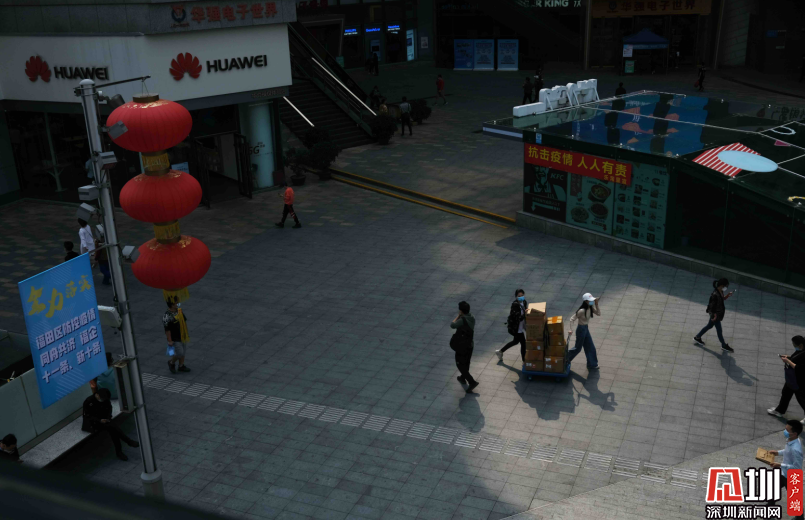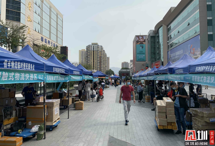 華強北步行街上的非接觸物流快遞區(qū)。