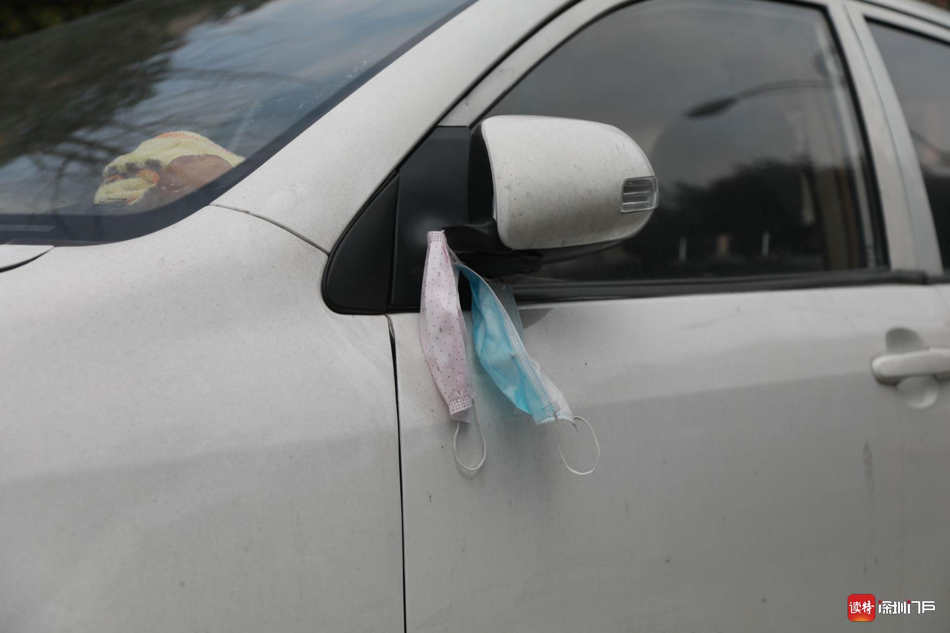 2月25日,監(jiān)利,某小區(qū)門口停在路邊的私家車,后視鏡上掛著兩只早已被遺棄的口罩。