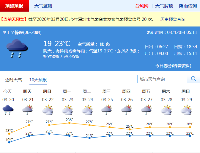 據(jù)深圳氣象臺預(yù)報,20日有雷陣雨,局部大雨,氣溫20-24℃;21日降雨結(jié)束。21-24日溫暖濕潤,早晚有輕霧或霧;25-26日有雷陣雨。