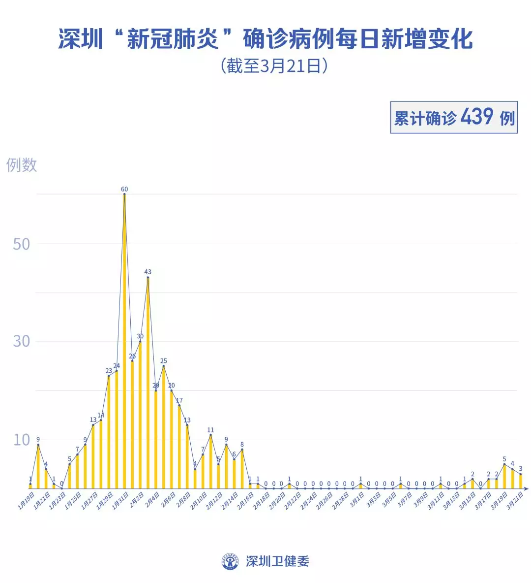 截至3月21日24時,深圳累計報告“新冠肺炎”病例439例。3月21日當(dāng)天新增3例,出院1例。