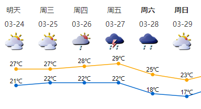 24-25日多云,早晚能見度較低,24日氣溫21-27℃;