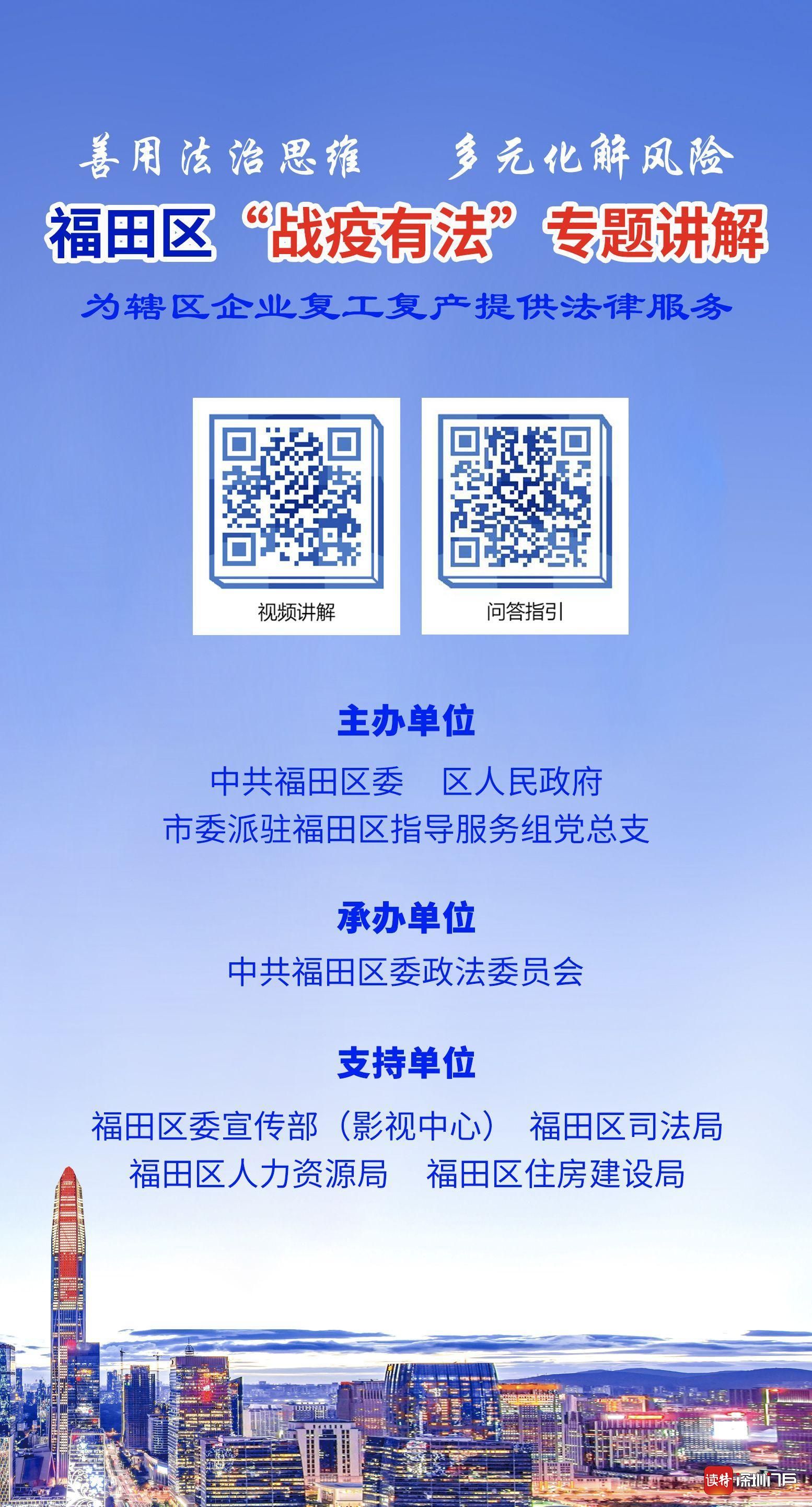 據(jù)悉,福田區(qū)“戰(zhàn)疫有法1+10”行動(dòng)”是福田區(qū)委區(qū)政府和市委派駐福田區(qū)指導(dǎo)服務(wù)組黨總支組織策劃,區(qū)委政法委牽頭實(shí)施,結(jié)合市統(tǒng)一開展的“戰(zhàn)疫有法”行動(dòng),落實(shí)“依法防疫”要求,整合區(qū)委宣傳部、區(qū)司法局、區(qū)人力資源局、區(qū)住建局等相關(guān)部門、各街道和各法律服務(wù)團(tuán)相關(guān)資源,指導(dǎo)和幫助福田區(qū)企業(yè)解決復(fù)工復(fù)產(chǎn)過程中面臨的法律風(fēng)險(xiǎn)問題。