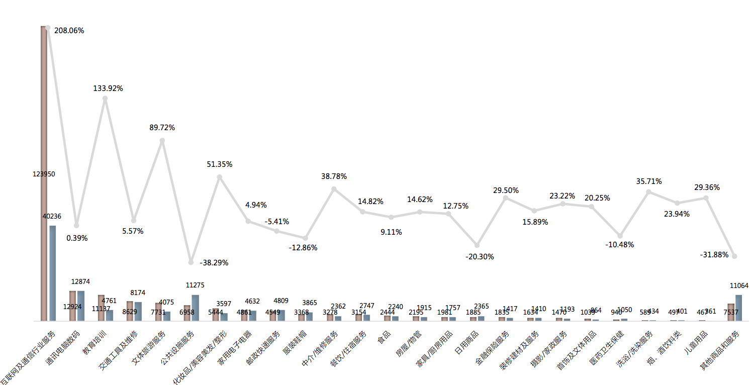 據(jù)統(tǒng)計(jì),2019年,互聯(lián)網(wǎng)及通信行業(yè)服務(wù)、通訊電腦數(shù)碼、教育培訓(xùn)行業(yè)投訴量排名位居前三,分別為123950宗、12924宗、11137宗,分別占全年投訴總量的56.21%、5.86%、5.05%。從投訴量變化情況來(lái)看,互聯(lián)網(wǎng)及通信行業(yè)服務(wù)、文體旅游服務(wù)、教育培訓(xùn)及化妝品/美容美發(fā)/整形四個(gè)行業(yè)投訴量同比增長(zhǎng)超過(guò)50%;公共設(shè)施服務(wù)、日用商品、服裝鞋帽以及醫(yī)藥衛(wèi)生保健四個(gè)行業(yè)投訴量同比下降超過(guò)10%。其中公共設(shè)施服務(wù)類(lèi)的減幅最大,為38.29%,主要原因?yàn)楣蚕沓鲂行袠I(yè)洗牌,部分企業(yè)退出市場(chǎng),投訴量隨之下降。