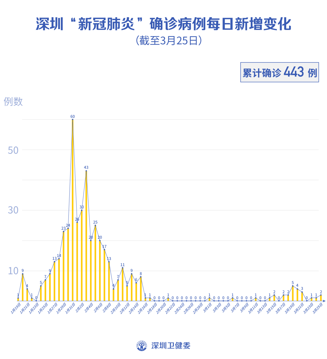 截至3月25日24時,深圳累計報告“新冠肺炎”病例443例。3月25日當天新增2例,出院1例。