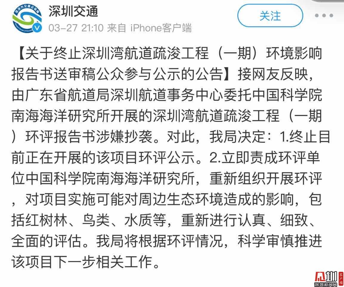 3月27日21時10分,深圳市交通運輸管理局官方微博發(fā)布消息稱:接網(wǎng)友反映,由廣東省航道局深圳航道事務(wù)中心委托中國科學(xué)院南海海洋研究所開展的深圳灣航道疏浚工程(一期)環(huán)評報告書涉嫌抄襲。對此,深圳市交通運輸管理局決定:1.終止目前正在開展的該項目環(huán)評公示。2.立即責(zé)成環(huán)評單位中國科學(xué)院南海海洋研究所,重新組織開展環(huán)評,對項目實施可能對周邊生態(tài)環(huán)境造成的影響,包括紅樹林、鳥類、水質(zhì)等,重新進(jìn)行認(rèn)真、細(xì)致、全面的評估。深圳市交通運輸管理局將根據(jù)環(huán)評情況,科學(xué)審慎推進(jìn)該項目下一步相關(guān)工作。