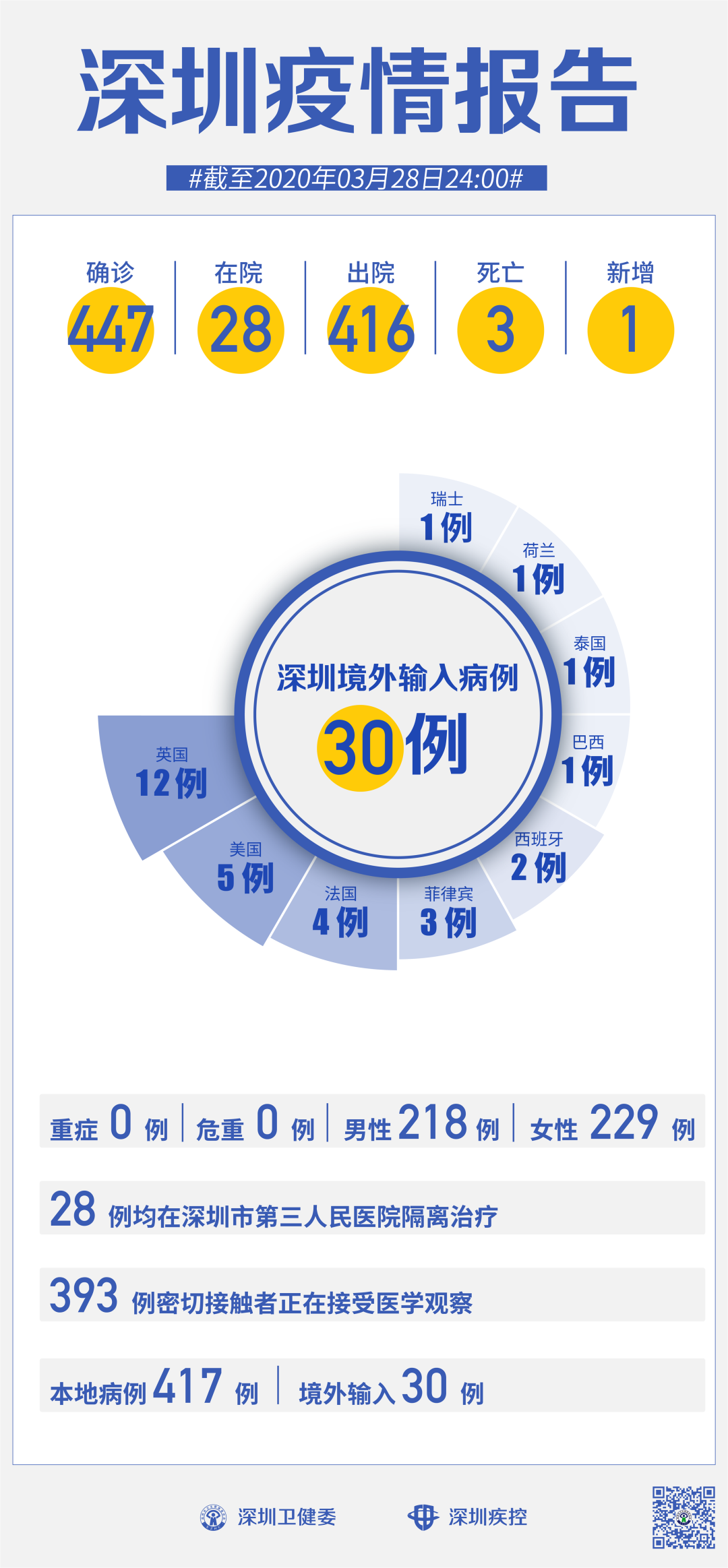 截至3月28日24時(shí),深圳累計(jì)報(bào)告“新冠肺炎”病例447例。3月28日當(dāng)天新增1例。