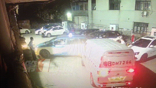 監(jiān)控畫面顯示,25日晚上23點左右,一輛出租車和一輛面包車先后到達(dá)龍崗大道木棉灣路段的一個充電站。出租車司機先找到了一個位置,準(zhǔn)備倒入充電時,后面的面包車突然往前開,兩名司機因為停車位的問題發(fā)生爭執(zhí)。隨后,出租車司機下車?yán)碚?,動手推搡了面包車司機一下。