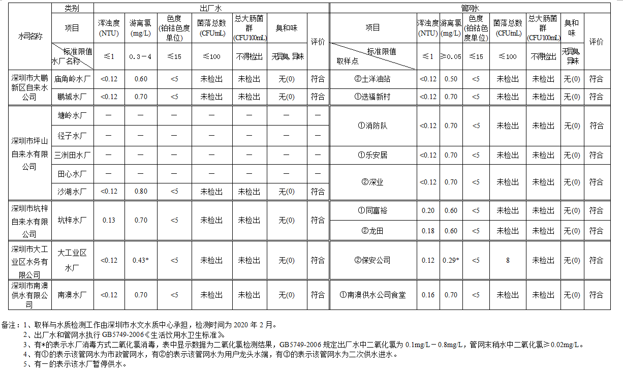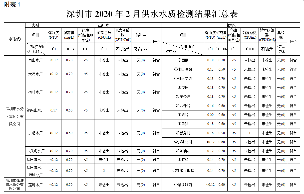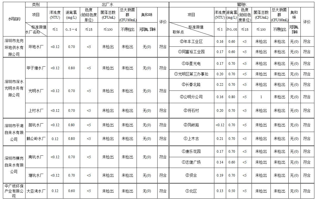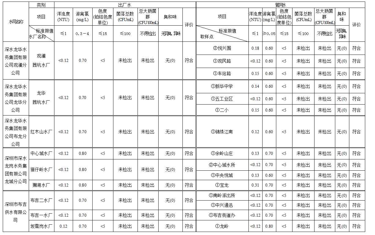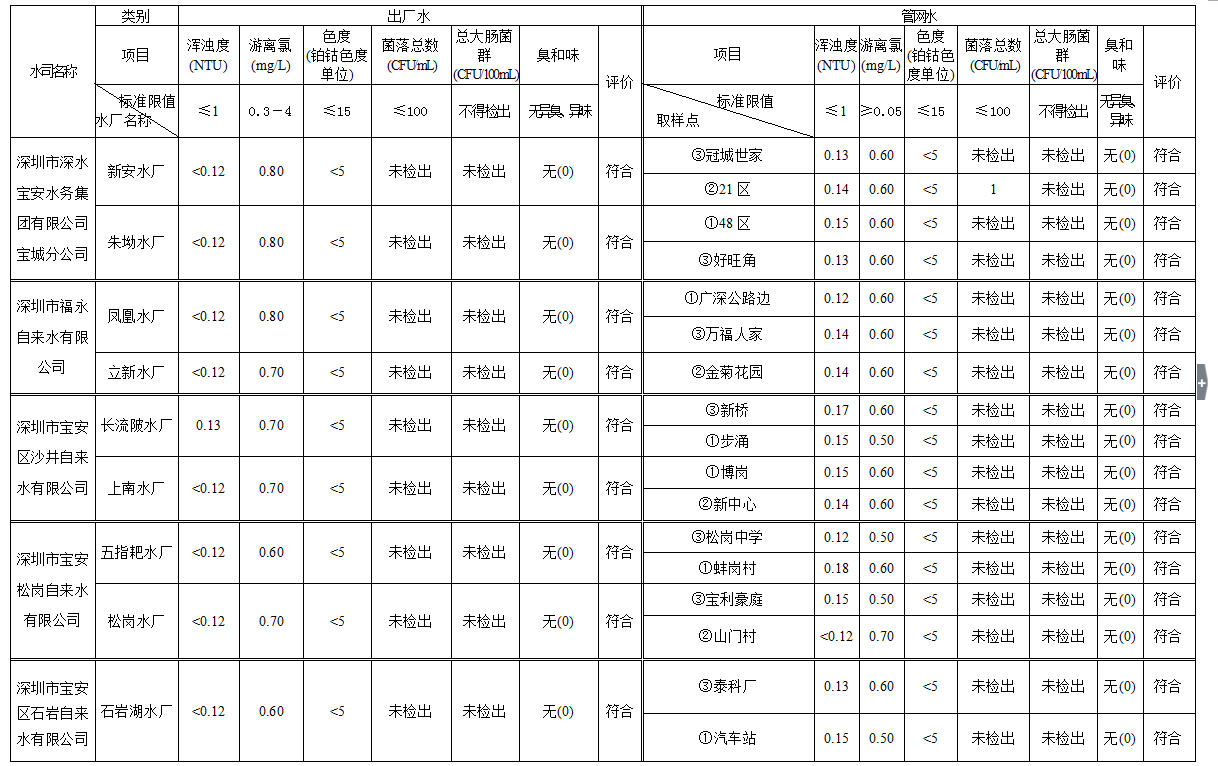 見圳客戶端·深圳新聞網(wǎng)2020年4月4日訊(見圳客戶端、深圳新聞網(wǎng)記者葉梅)2020年2月,深圳市水務(wù)局對全市42個水廠出廠水水樣以及68個管網(wǎng)水水樣進行了抽檢。檢測結(jié)果表明,依據(jù)GB5749—2006《生活飲用水衛(wèi)生標準》,所有受檢42個出廠水水樣和68個管網(wǎng)水水樣的渾濁度、消毒劑(游離氯或二氧化氯或總氯)、色度、菌落總數(shù)、總大腸菌群及臭和味共6項常規(guī)指標全部符合該標準的規(guī)定,出廠水水樣合格率為100%,管網(wǎng)水合格率為100%。