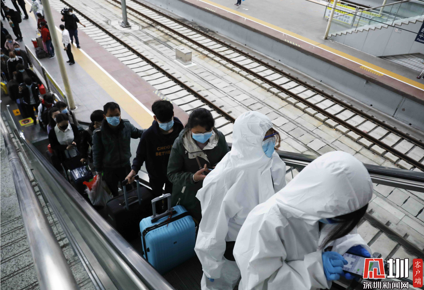深圳北西廣場(chǎng)出口處,安檢人員正在檢測(cè)旅客體溫。