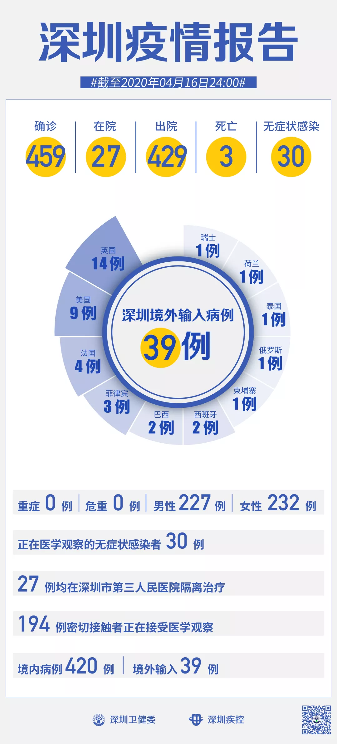截至4月16日24時(shí),深圳累計(jì)報(bào)告新冠肺炎病例459例。4月16日當(dāng)天新增境內(nèi)病例1例,新增無癥狀感染者1例。