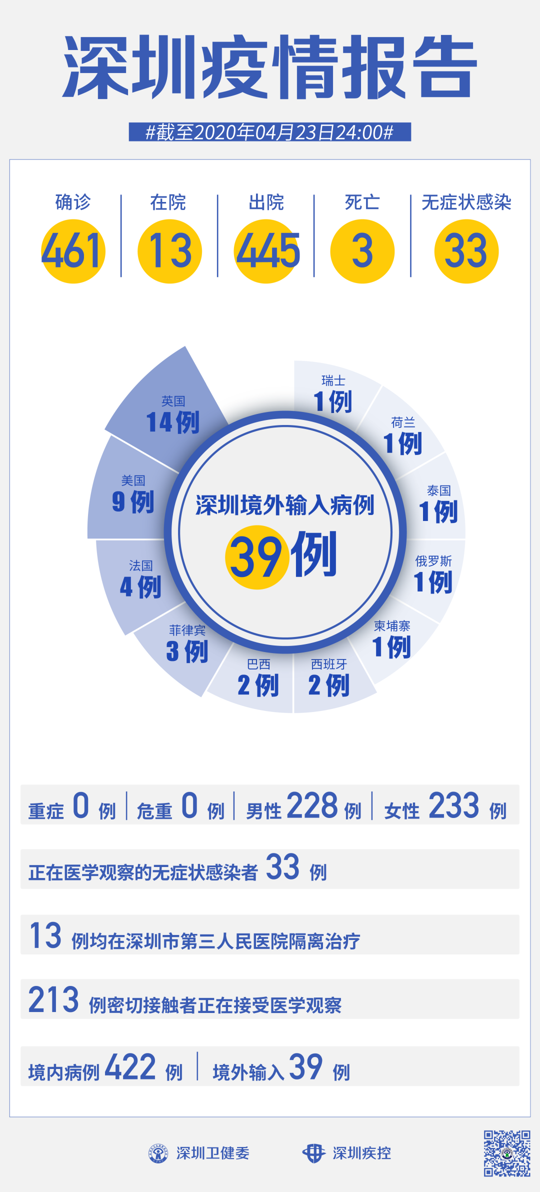 截至4月23日24時(shí),深圳累計(jì)報(bào)告新冠肺炎病例461例。4月23日當(dāng)天新增出院5例。