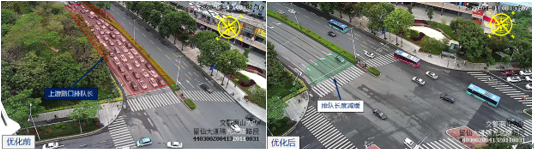 針對這一現(xiàn)象,深圳交警將東向一條直行車道改為左轉車道,并根據(jù)實際流量提高了東方向左轉綠燈時長。優(yōu)化后路口排隊現(xiàn)象得到緩解路口總平均排隊長度由310米下降至168米,降幅45.80%。