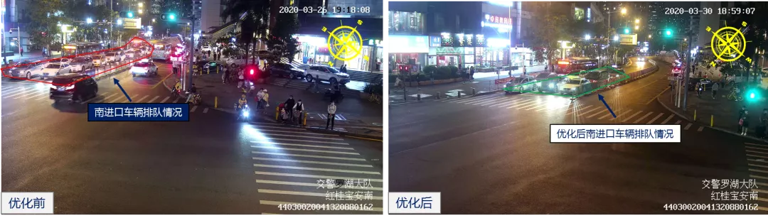 針對此情況,深圳交警對該路口綠信比方案進行優(yōu)化調整,延長西面放行時間,同時壓縮北面和東面放行時間。優(yōu)化后,路口晚高峰持續(xù)時間縮短17.6%,南進口車輛通行效率提升明顯,路口其余方向車輛排隊無明顯增加。