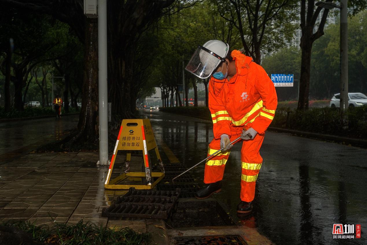 福田分公司員工殷海峰,正打開雨水篦子加速排水。