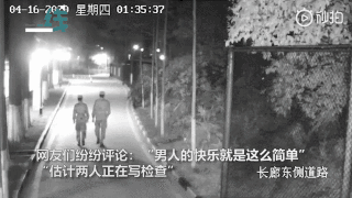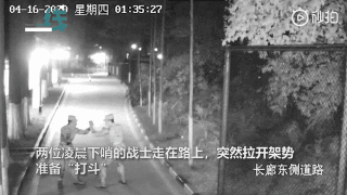 兩位凌晨下哨的戰(zhàn)士走在路上,突然間拉開架勢,準備“打斗”。劍拔弩張之際,突然畫風一轉(zhuǎn),兩人做起了互相加油打氣的動作。