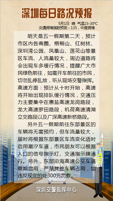 沈海高速、惠鹽高速、龍大高速、武深高速車流量大的情況可能延續(xù)。市內(nèi)各商圈、景區(qū)的客流量及其周邊道路壓力較大,全市出行車流將持續(xù)增加。