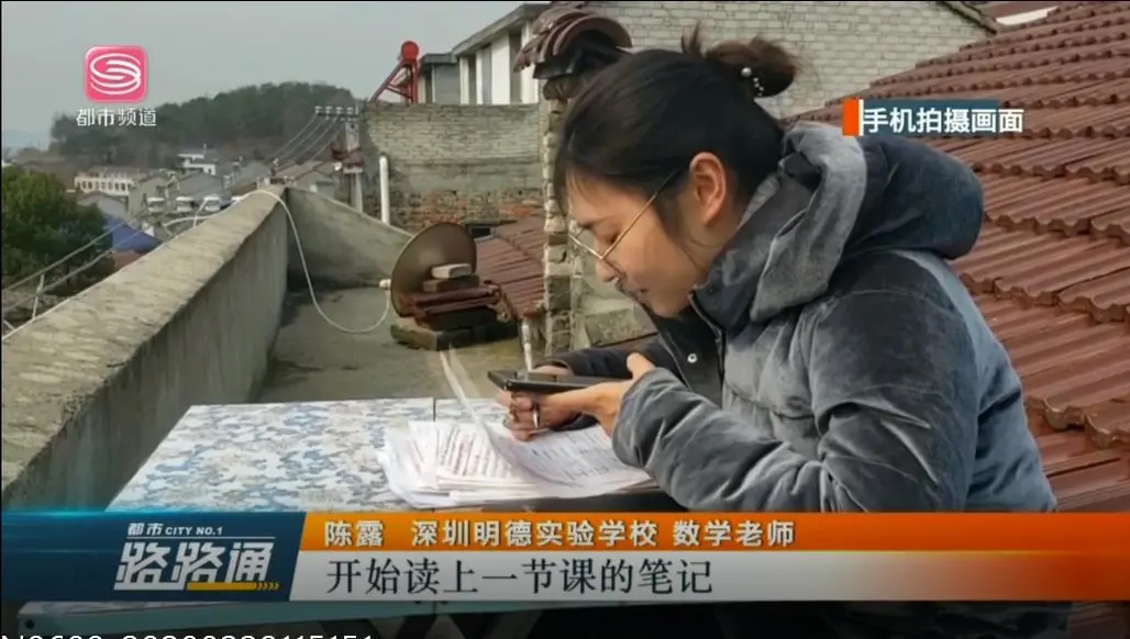 深圳中小學網(wǎng)課開課以來,廣大青年教師克服種種不利條件,變身教育主播,讓知識穿越屏幕直達學生心靈,深圳明德實驗學校的陳露老師就是其中一位典型代表。她因疫情滯留于湖北農(nóng)村,由于信號差,一開始為了錄制微課,白天她就帶好口罩跑到雜草叢生的山頂找信號,一塊木頭當?shù)首樱侣壬蟼饕曨l,頂著寒風一坐就是半天。線上教學正式開課后,由于設(shè)備和信號問題,陳老師只能采用QQ直播的方式給學生上課,為了保障語音效果,她把課堂搬到信號稍強的屋頂。上屋頂不是件容易的事,陳老師必須先爬一個陡峭的梯子,再匍匐穿過一個孔洞才能到達。一個天臺、一張折疊桌成了她的“三尺講臺”,一疊信紙成了她的“黑板”,一部手機成了她的“多媒體”。陳露老師每天坐在樓頂?shù)暮焙惋L雪中,堅持完成直播課,保證學生正常的線上學習。