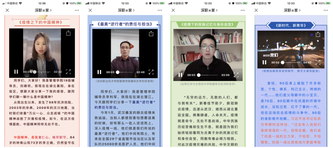 深圳職業(yè)技術(shù)學院學生工作部組織33位青年輔導員,推出33講戰(zhàn)“疫情”系列微課程,每天8:30準時推送。微課程主題涵蓋愛國主義教育、理想信念教育、生命教育、社會責任感教育、感恩教育,不同的主題、不同的視頻、不同的感悟,輔導員老師和同學們一起在戰(zhàn)“疫”中成長,為同學們講述每一個戰(zhàn)“疫”的感人故事。建環(huán)學院輔導員薛菲菲老師制作精美短視頻、撰寫文案、配樂、配音,以有思想又有溫度的方式與學生對話。她說,磨煉是成長的催化劑,抗疫是時代給予的成人禮,經(jīng)此一役,中國的年輕人們對責任和奉獻的感受更加直觀,對勇敢和擔當?shù)睦斫飧由羁?,而中國,也因?0后,收獲了青春洋溢的蓬勃力量!