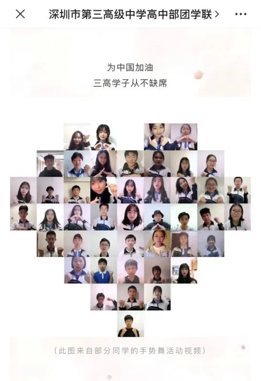 深圳市第三高級中學團委的龐聰老師和同學們一起錄制了手勢舞《不放棄》,為抗疫一線吶喊加油!活動先由龐聰老師和團委學生聯(lián)合會的同學們策劃、學習、錄制、剪輯、審核,共同制作第一支手勢舞視頻。2月22日,他們在網(wǎng)上發(fā)起手勢舞接力,收到上百名師生發(fā)來的接力視頻,經(jīng)過校團委匯總、剪輯、發(fā)布,引起強烈的社會反響。龐老師說:“疫情無情,人間有愛,正是疫情讓我們緊緊地依靠在一起,手勢舞應(yīng)援雖不隆重盛大,但卻也凝結(jié)了我們師生對于疫情重地武漢的鼓勵與支持,對一線醫(yī)療工作者的無私奉獻的感謝?!?/p>
