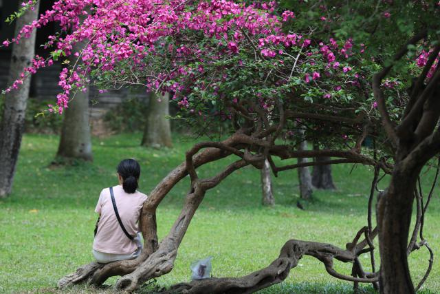 ▲市民在公園的樹下乘涼。