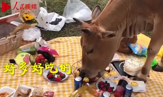 最近福建福清的幾位同學吭哧吭哧爬了一個小時的山,在草地上剛鋪好餐布擺完食物,正準備拍照時,來了一頭牛……
