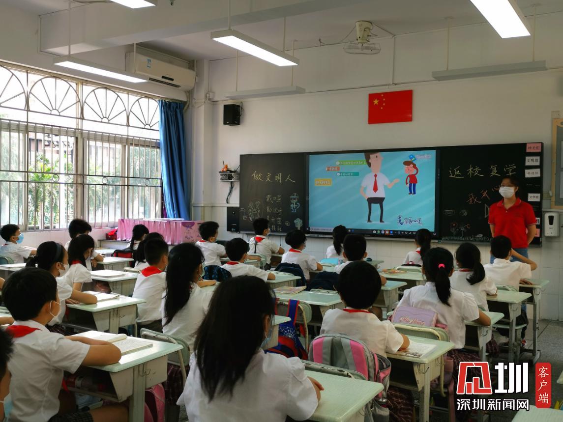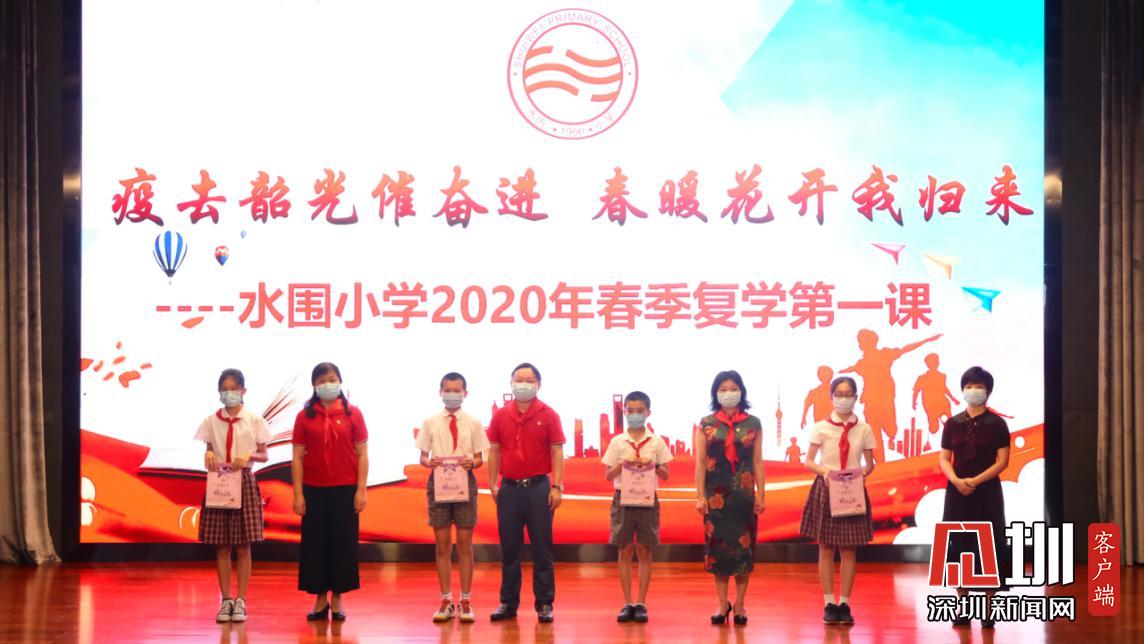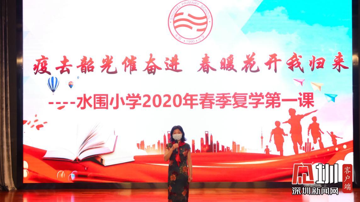 據(jù)悉,水圍小學(xué)“復(fù)學(xué)典禮”上午8:40正式開(kāi)始,出席的嘉賓有福田區(qū)教科院教研員、少先隊(duì)總輔導(dǎo)員李楠、衛(wèi)生健康副校長(zhǎng)明昭。各班級(jí)的學(xué)生則帶著口罩,單人單桌在教室內(nèi),以觀看直播的方式參加典禮。