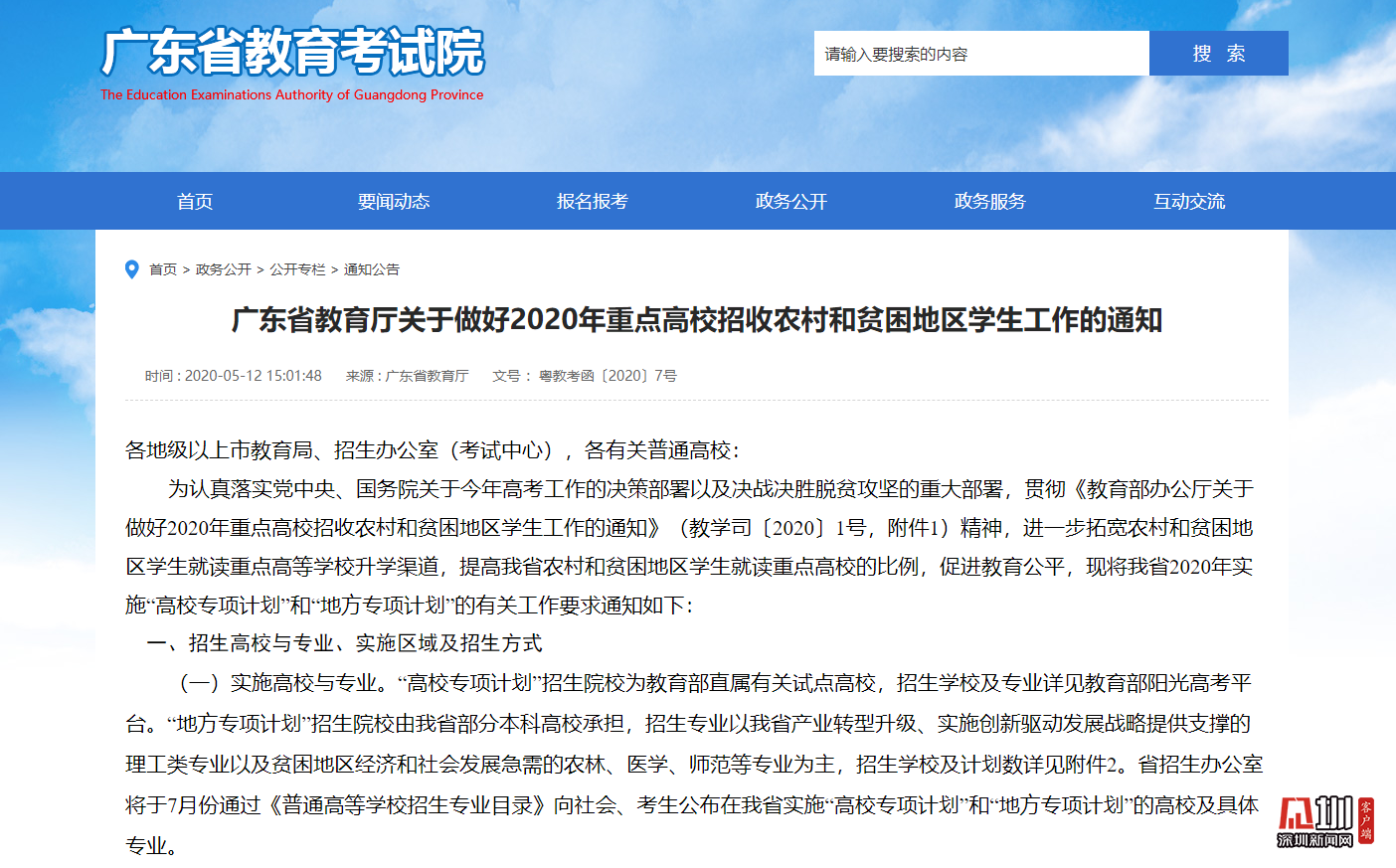 見圳客戶端·深圳新聞網(wǎng)2020年5月13日訊(見圳客戶端、深圳新聞網(wǎng)記者 吳英敏 金洪竹)5月13日,記者從廣東省教育廳獲悉,為進一步拓寬農(nóng)村和貧困地區(qū)學生就讀重點高等學校升學渠道,提高廣東省農(nóng)村和貧困地區(qū)學生就讀重點高校的比例,促進教育公平,2020年廣東省將實施“高校專項計劃”和“地方專項計劃”,做好重點高校招收農(nóng)村和貧困地區(qū)學生工作。