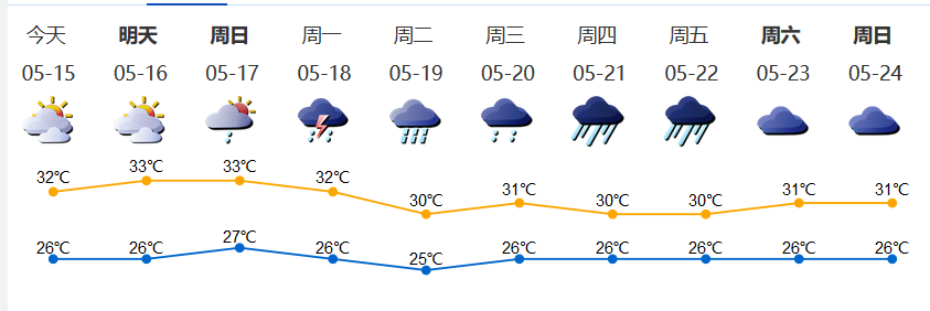 我市多云間晴天,局部有短時(雷)陣雨;氣溫26-32℃;東南風(fēng)2-3級;相對濕度60%-90%。