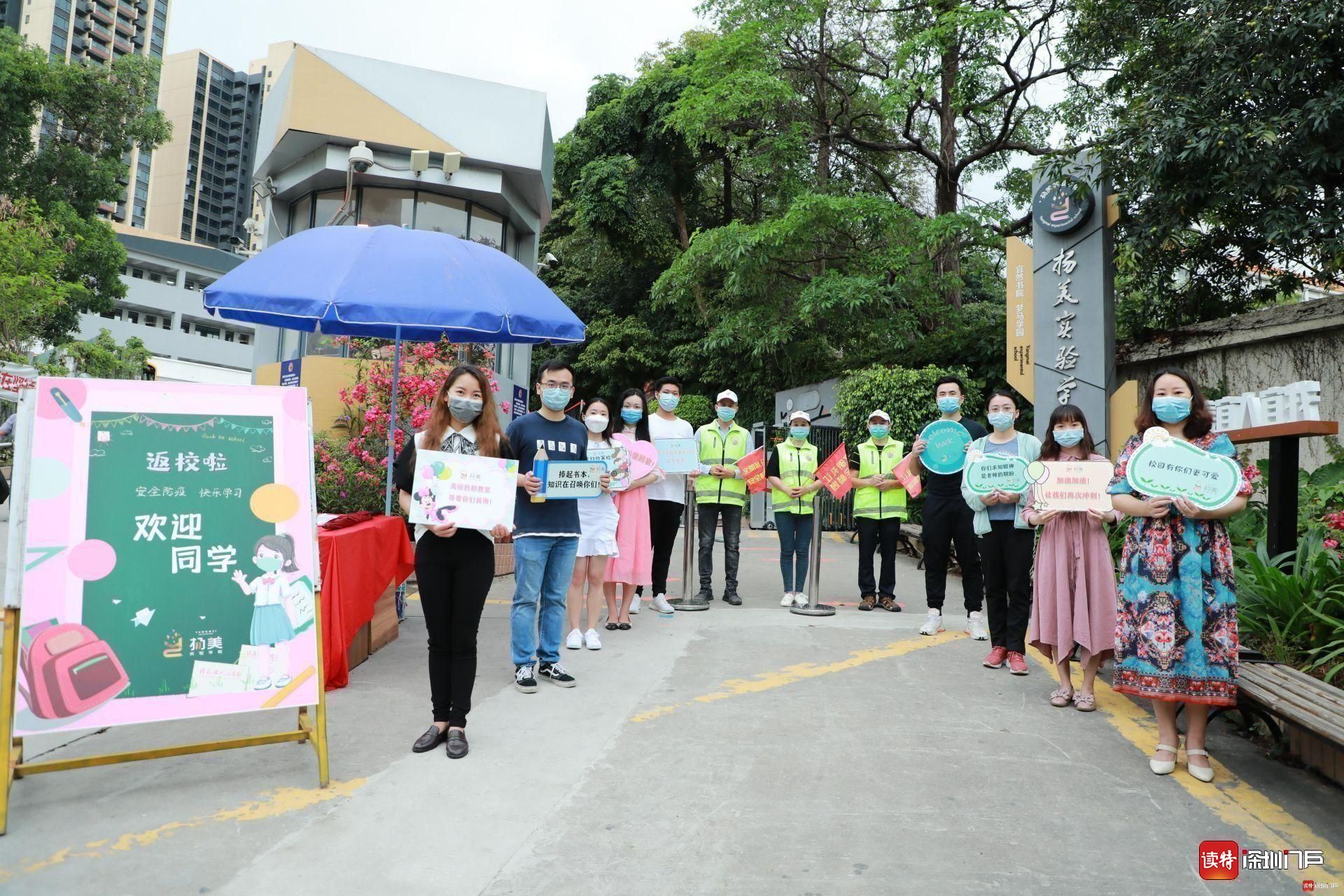 揚(yáng)美實(shí)驗(yàn)的老師們捧著特制歡迎牌,向返校的孩子們問好。家長義工們身穿綠馬甲、手持小紅旗,在校門附近疏通交通,為孩子們保駕護(hù)航。揚(yáng)美學(xué)子佩戴口罩,按照錯(cuò)峰時(shí)間表通過體溫測(cè)量儀,有序進(jìn)入校園。