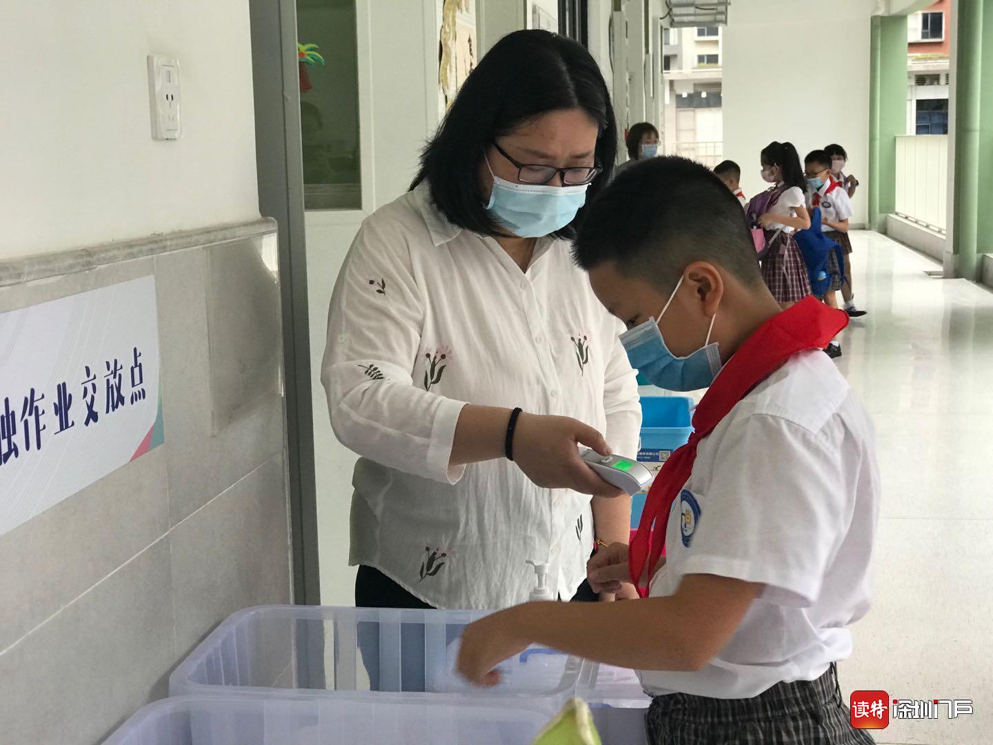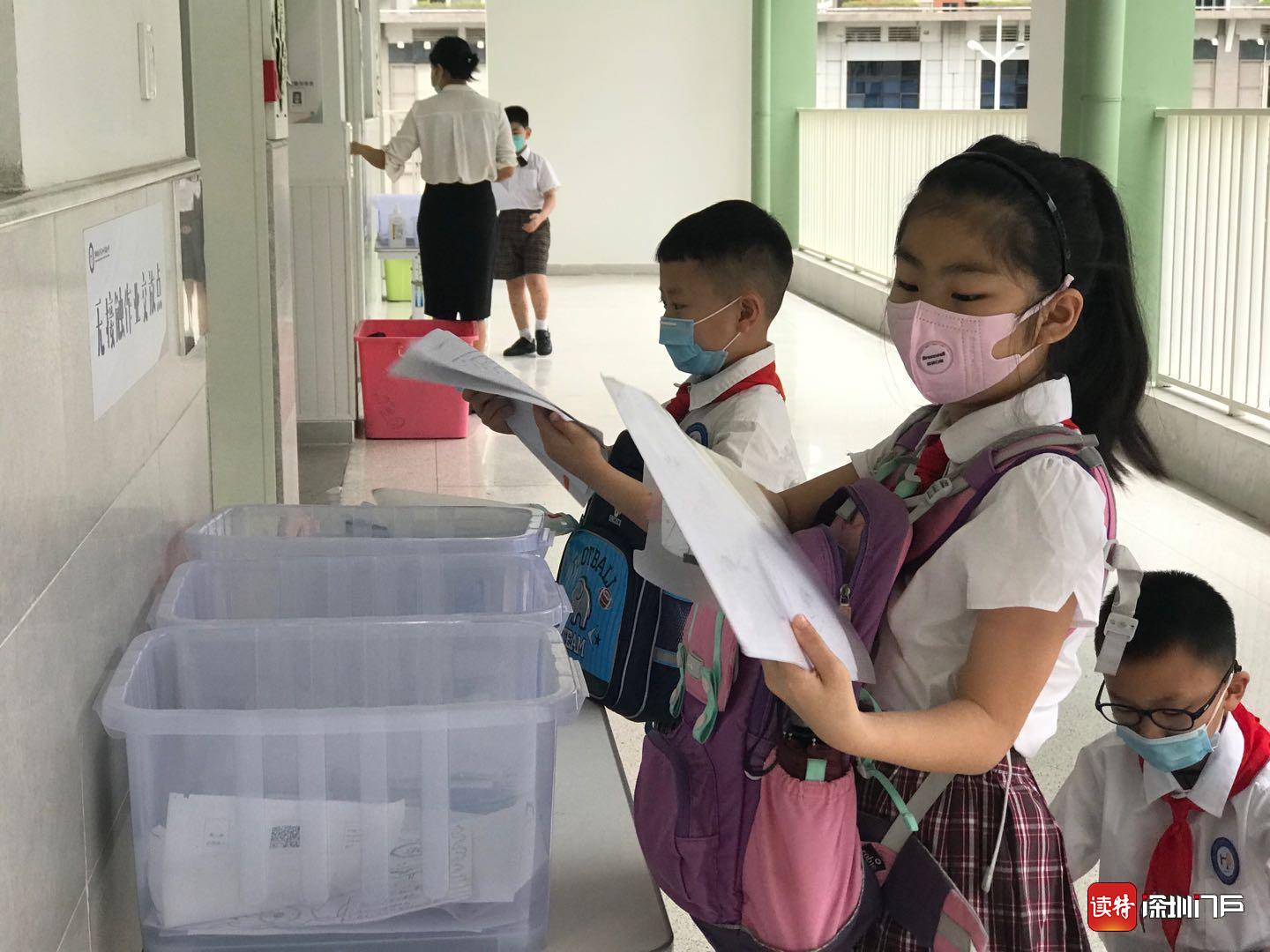 “同學(xué)們?cè)缟虾?!”“老師們好!?8日一大早,龍華區(qū)和平實(shí)驗(yàn)小學(xué)的老師們都早早做好準(zhǔn)備,站在學(xué)校門口,迎接孩子們歸來。在各班教室門口,學(xué)校還貼心的準(zhǔn)備了“無接觸作業(yè)交站點(diǎn)”,同學(xué)們按順序自覺將學(xué)科作業(yè)放進(jìn)箱內(nèi),減少了不必要的接觸。(讀特記者何亞南)