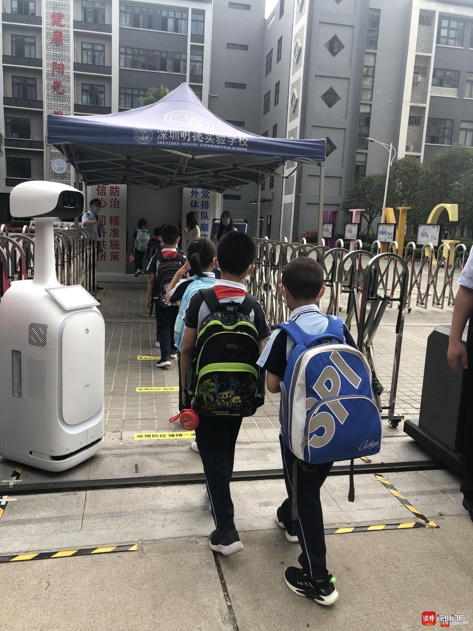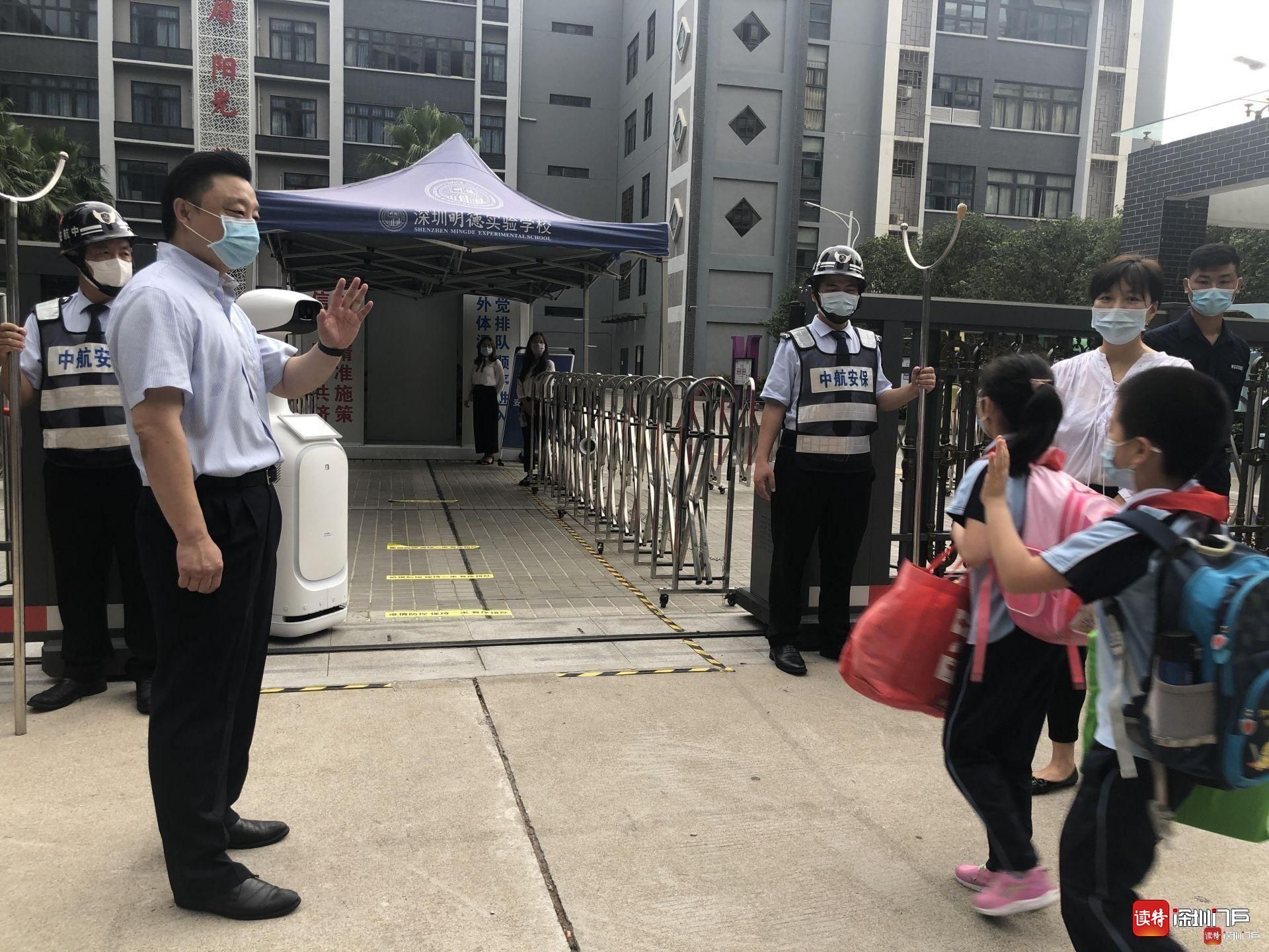 “同學(xué)們好!”“歡迎回來!”從7點(diǎn)起,明德實(shí)驗(yàn)學(xué)校校長魯江與工作人員就在香蜜校區(qū)校門口迎候?qū)W生們,提醒孩子們戴好口罩,也與家長們交流返校事宜。校門口的一臺(tái)超氧水消殺機(jī)器人也在積極投入工作,工作人員在后臺(tái)控制面板可以監(jiān)測(cè)到入校人員的體溫情況。