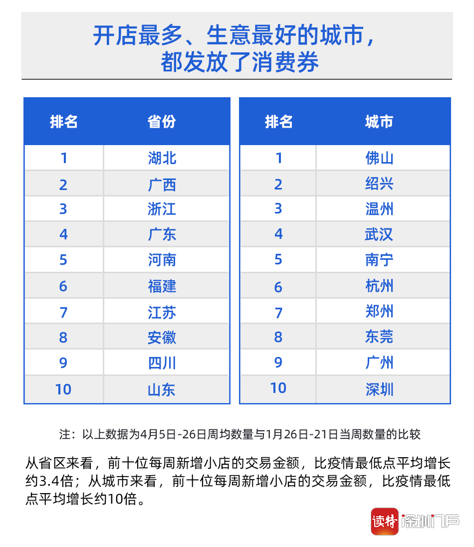 值得注意的是,排名前十的省份及城市,絕大多數(shù)都通過支付寶發(fā)放了消費(fèi)券。4月份以來,佛山、珠海、東莞、清遠(yuǎn)、深圳羅湖和龍崗區(qū)陸續(xù)通過支付寶等平臺發(fā)放消費(fèi)券,廣東發(fā)放消費(fèi)券總額已經(jīng)超過10億元,成為全國發(fā)放消費(fèi)券最多的省份之一。尤其是上述排名第一的佛山,在市區(qū)兩級消費(fèi)券刺激下,線下餐飲、美容美發(fā)等行業(yè)迎來一波消費(fèi)熱潮。阿里本地生活數(shù)據(jù)顯示,自佛山消費(fèi)券發(fā)布后,佛山線下餐飲門店新開業(yè)環(huán)比增幅超過35%,餐飲類消費(fèi)訂單量環(huán)比增幅也超過了152%,美容美發(fā)訂單增長了350%以上。