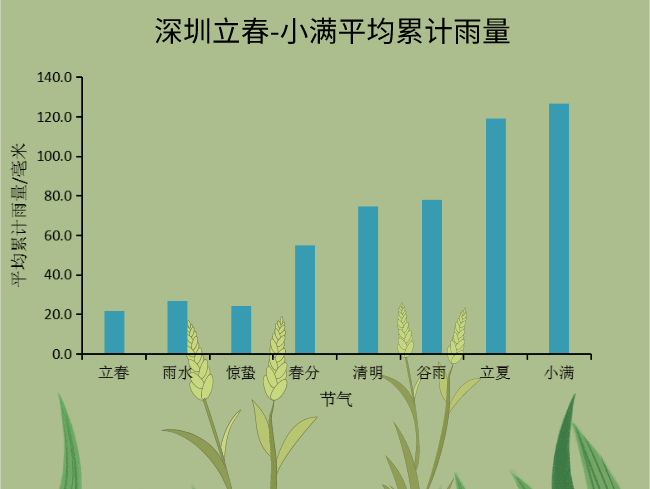 小滿節(jié)氣,除了氣溫不斷地攀升,雨水也逐漸增多。伴隨著南海夏季風(fēng)的爆發(fā),所謂小滿大滿,江河水滿,意思是小滿節(jié)氣強(qiáng)降水過程頻繁,間隔時間短,經(jīng)常一波接一波。進(jìn)入小滿節(jié)氣后,深圳也進(jìn)入了一年一度的“龍舟水”時期。此時南方的暖濕氣流活躍,與北方南下的冷空氣交匯,往往會出現(xiàn)持續(xù)大范圍的強(qiáng)降水。氣象統(tǒng)計數(shù)據(jù)顯示,小滿節(jié)氣后15天深圳平均累計雨量為126.9毫米,比之前的立夏時節(jié)降水更加豐沛。